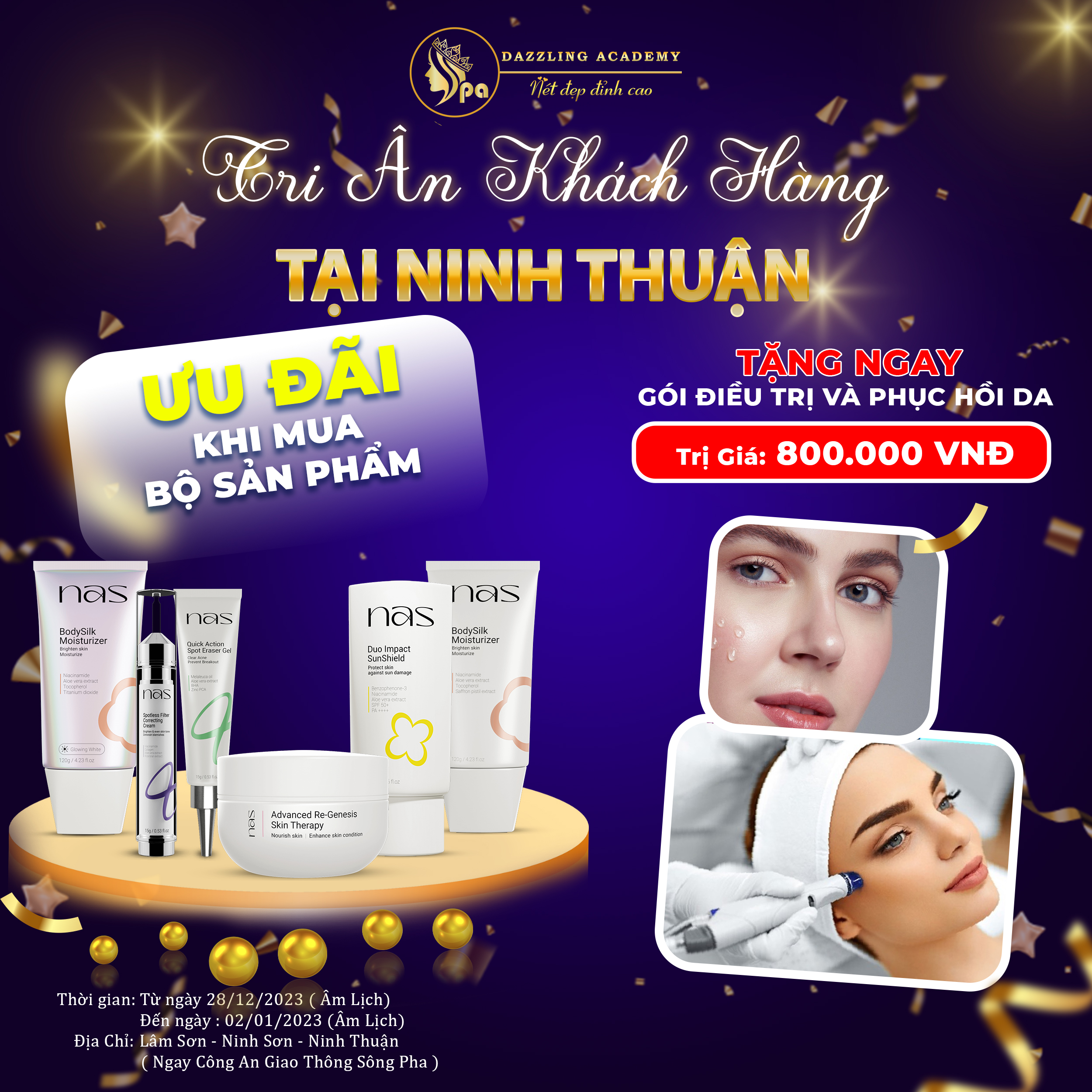 Khi mua bất kỳ bộ sản phẩm Nas, quý khách sẽ được tặng ngay 1 gói điều trị phục hồi da trị giá 800.000đ.